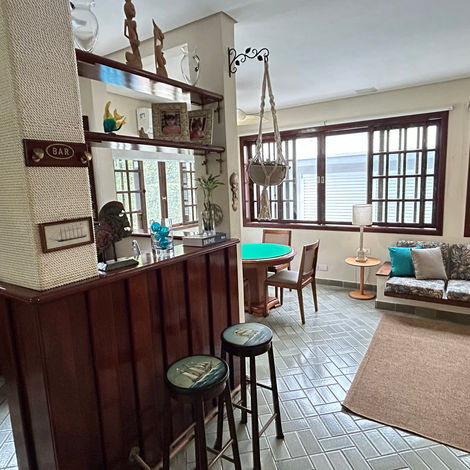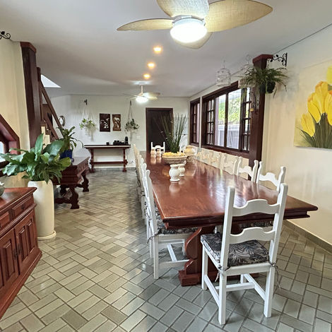 A presença de ar-condicionado e ventiladores de teto contribui para manter o ambiente confortável em diferentes momentos do dia, acompanhando o ritmo de uso da casa com bem-estar. O lavabo complementa a área social, trazendo praticidade para grupos maiores e facilitando a dinâmica dos encontros.